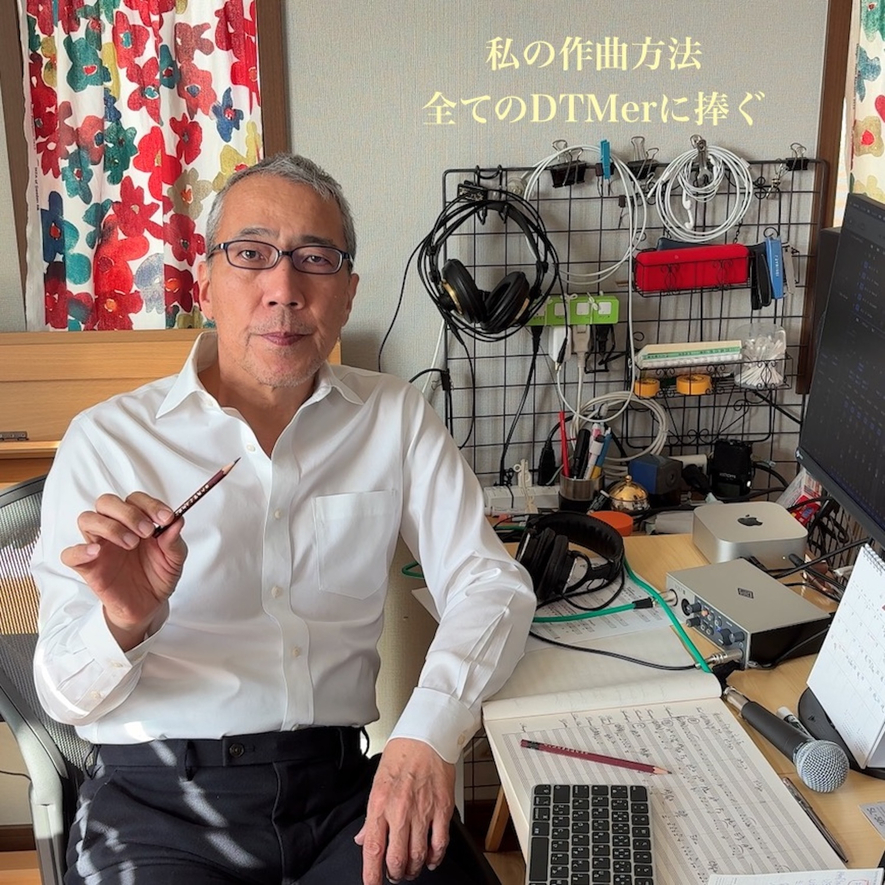 本作「私の作曲方法~全てのDTMerに捧ぐ」は、フランスの音楽制作集団・KodanaSoundsの活動5周年記念アルバムへの楽曲提供依頼をきっかけに制作しました。日頃から「どうやって作曲するのですか?」と尋ねられることが多く、そのたびに言葉に詰まってしまう自分がいました。作曲の過程は決してスマートではなく、苦しみや迷いと常に隣り合わせだからです。いまやコンピュータは作曲に欠かせない存在ですが、私が作曲を志した20代の頃は、五線紙と鉛筆がすべてでした。レガシーとなった手法と、DTMを身につけた現在の自分、その両方を知るからこそ伝えられる「作曲のリアル」があるのではないか……そう考え、「私はこうやって作曲する」という自己紹介であり、同時に、すべての作曲家への応援歌としてこの曲を書きました。